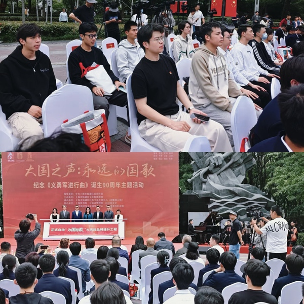 “起来,不愿做奴隶的人们,把我们的血肉,筑成我们新的长城……”,九十年前《义勇军进行曲》正式问世,这首熔铸了四万万民众救亡热望的民族战歌,自此从上海唱响大江南北。5月8日,国歌展示馆的纪念广场上一场以“大国之声:永远的国歌”为主题的纪念《义勇军进行曲》诞生90周年活动在此举行。我校 本科生第一党支部师生党员代表们受邀参加本次活动