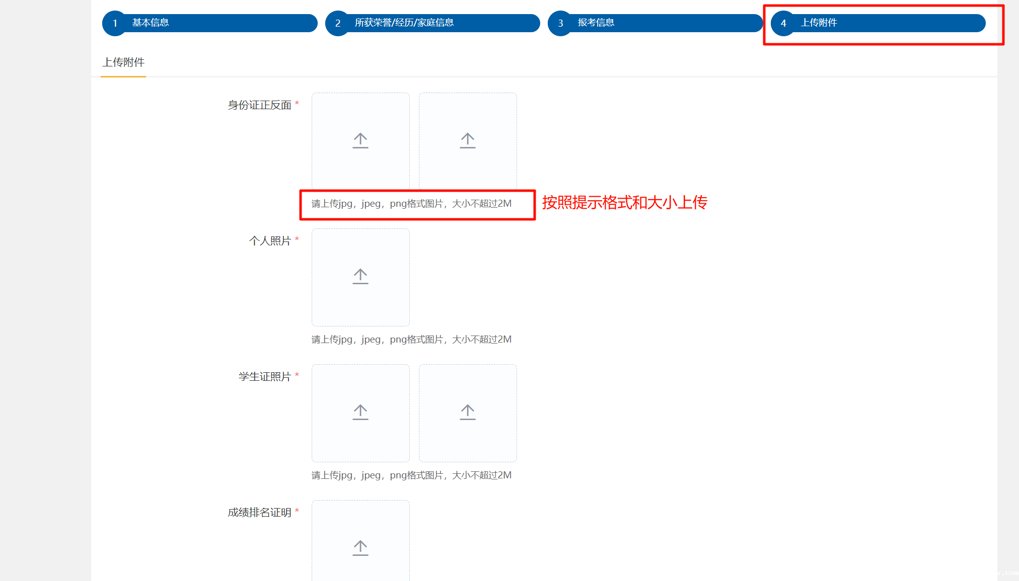 如上传失败,请检查文件格式与大小是否符合要求,且上传附件的命名中不可包含特殊符号如“*、%、空格、#、{、【”等。