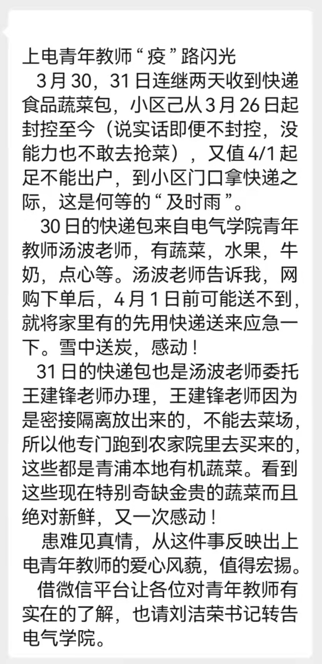 近日,一封名为《上电青年教师“疫”路闪光》的感谢信,通过微信的方式发送到学校退管办干部的手机上。写信者为我校 退休教师屠志健,他感谢的对象,是该学院青年教师汤波。