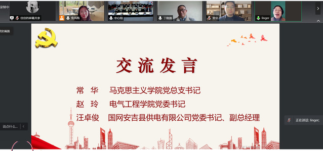 赵玲表示,丁教授的授课深入浅出、耐人回味,让我们充分感受到了一位党史研究者的专业与严谨。 、马克思主义学院与国网安吉供电公司共同联建学习,是我校在专业教学课程思政、思政课主渠道以及电力企业用人单位三方在协同育人方面做出的探索和努力,提供了一起学习交流如何在人才培养工作中从党的百年奋斗历程中汲取经验、智慧和力量的机会。疫情当前,我们更要学会在疫情防控的工作落实中弘扬和践行伟大建党精神。