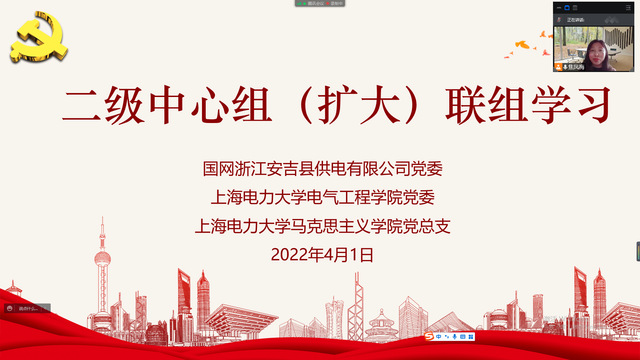 4月1日下午,马克思主义学院党总支、 党委与国网浙江安吉供电有限公司党委,联合开展线上二级中心组(扩大)联组学习。会议特邀华东师范大学马克思主义学院丁晓强教授,做《党的创建与伟大建党精神》主题讲座。国网浙江安吉供电有限公司总经理、党委副书记石勇,党委书记、副总经理汪卓俊, 党委书记赵玲,党委副书记、院长李东东,马克思主义学院党总支书记常华,常务副院长、党总支副书记焦凤梅等出席会议,马克思主义学院全体思政课教师参与学习。焦凤梅主持学习。