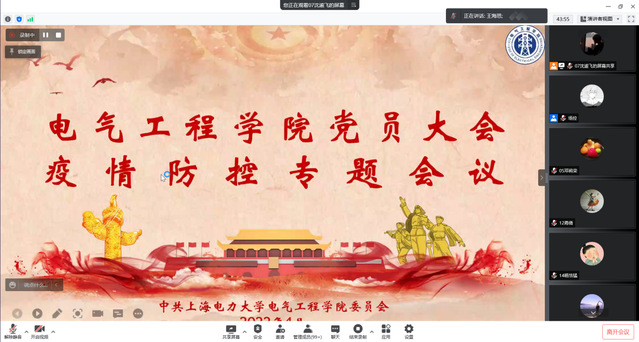 4月5日下午,为积极响应上海市教卫工作党委和校党委有关要求, 党委通过腾讯会议线上召开党员大会暨疫情防控专题会议。 党委书记赵玲、党委副书记叶华刚、学生支部书记和全体学生党员参加会议。会议由学院专职组织员王海思主持。
