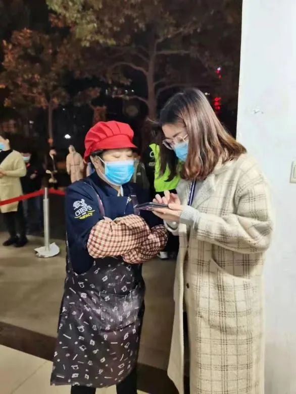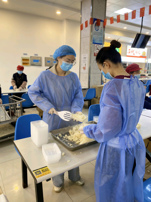 “唉!快看,是小朱老师!”同学们惊喜地在食堂发现了头戴厨师帽的辅导员,她正拿着勺子给同学们分饭。她笑着回应道:“小朱老师,为您服务!”