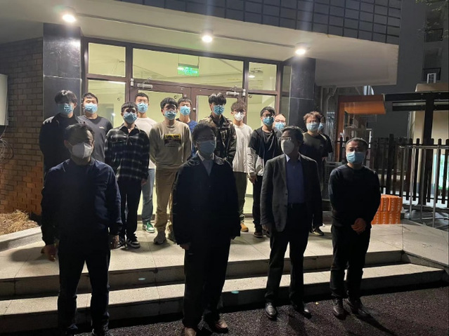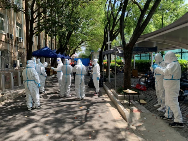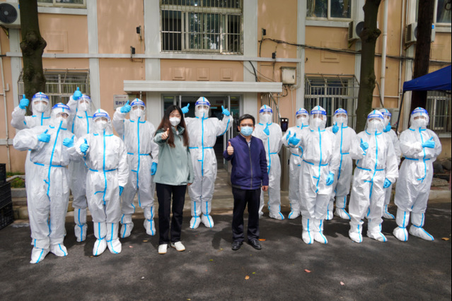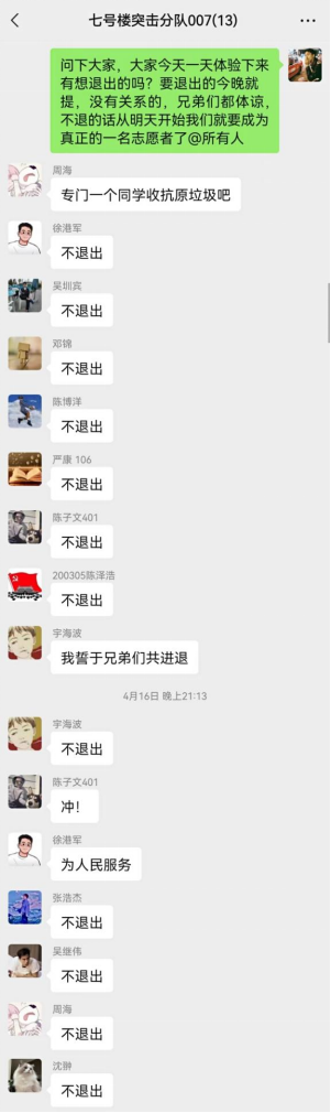 2022年4月15日傍晚, 杨浦校区依旧处于全校封控中,余开华老师紧急通知到由于目前学校正处于封控状态,校内工作人员急缺,现需要招募志愿者去帮助正处于严格管控中的4号宿舍楼同学们上门配送餐食、分发抗原、辅助核酸检测、处理生活垃圾等。这一则紧急通知揪紧了研究生公寓7号楼同学们的内心,几分钟后,一支由 研二同学们组成的13人“零零七”抗疫突击队成立了,他们分别是严康、宇海波、邓锦、沈翀、吴继伟、张浩杰、陈泽浩、程卓、周海、陈子文、陈博洋、徐港军、吴圳宾。