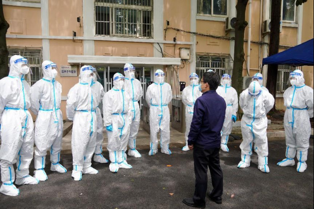 志愿者们换上防护服准备进入四号楼