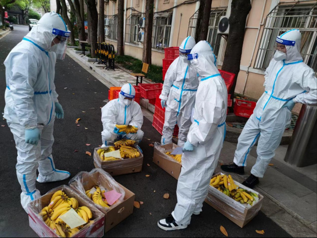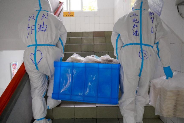 志愿者们给各层楼配送餐食、水果和物资