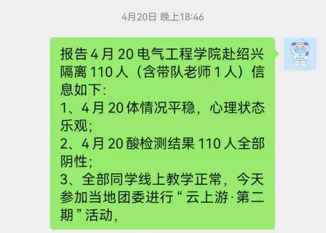 此后的14天,一直到隔离结束返校,桂世成都紧密关注百余名学生的健康状况以及核酸检测情况。学院团委和当地团委都为大家准备了许多活动,比如“云端生日会”,“云端游绍兴”等活动,桂世成作为学校学院和酒店方、绍兴当地社区的桥梁,一起做好隔离期间的日常管理,根据每天实际情况向学校转运专班汇报学生们学习、心理、生活、核酸等状况。这些工作看似很平凡,但为做到万无一失,需要极大的耐心与细致。而正是桂世成这份认真与坚守,保障了123名学生的健康安全;也正是有一个个与桂世成同志一样尽心尽责完成工作的师生们共同努力,我校才能在如此特殊的疫情局势下有条不紊地持续运转,保证在校师生学习工作生活需求。