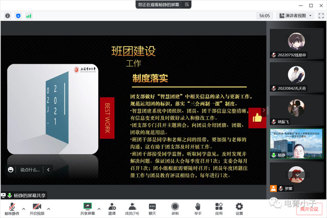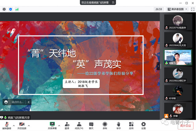 同辈榜样活动中,邓正臣学长向新生同学讲述了自己大学学习生活和求职经历,通过ppt的形式让新同学了解了与电气专业有关的工作类别和相关内容,分析了本专业目前的发展形势,并着重就毕业后的就业方向展开讲述;奚海涛学长从综合测评细则、班级学风建设、个人学业规划等方面进行讲述,建议班级制定灵活的学习自习模式来加强学风建设,如参加晚自习、建立学习互助小组及打卡图书馆;其他学长学姐也都围绕着学习、竞赛、科创、生活等方面进行了细致的阐述。