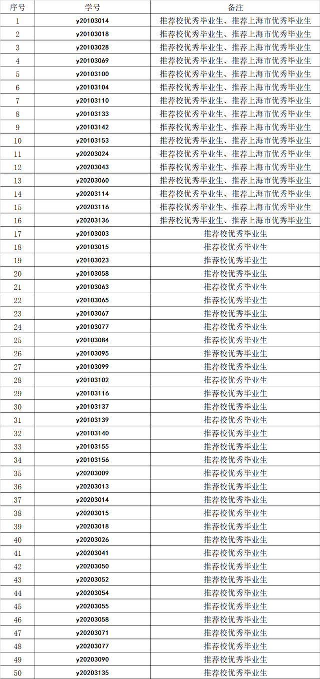 根据 关于 优秀毕业研究生的评选办法,经过研究生个人申报、二级学院评审小组评审,评选出50名毕业生推荐2023年度 优秀毕业研究生(其中16名推荐上海市优秀毕业生研究生),名单如下: