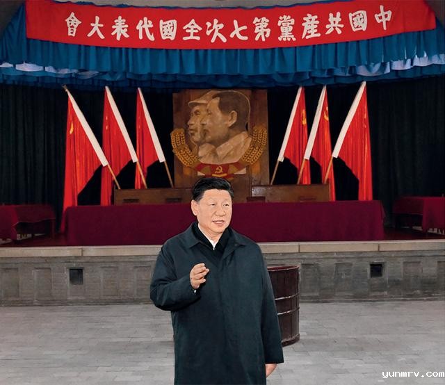 2022年10月27日,中共中央总书记、国家主席、中央军委主席习近平带领中共中央政治局常委李强、赵乐际、王沪宁、蔡奇、丁薛祥、李希,瞻仰延安革命纪念地。这是习近平在杨家岭瞻仰中共七大会址。 新华社记者 燕雁/摄