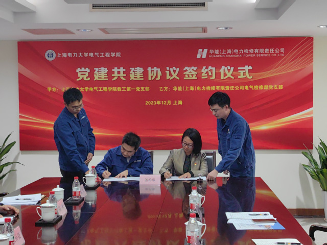 为深入学习贯彻习近平新时代中国特色社会主义思想和党的二十大精神,促进产教融合发展,12月14日下午, 教工第一党支部与华能(上海)电力检修有限责任公司电气检修部党支部共建签约仪式在宝山区盛石路288号检修公司办公楼105会议室举行。华能(上海)电力检修有限责任公司检修公司副总经理张仲毅、集团首席技师陆轶、培训中心主任陶晓波、电气检修部书记戴忠、电气检修部副主任徐庆欣、 电气学院副院长李晓露、电气学院院长助理吴文军、电气学院教工第一支部书记刘蓉晖、支部纪检委员赵璐、支部宣传委员孙改平、电气检修部党支部党员代表、 教工第一党支部党员代表出席。