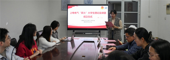 为深入学习贯彻习近平新时代中国特色社会主义思想和党的二十大精神,推动团员和青年主题教育走深走实,12月11日,上电电气“薪火”大学生理论宣讲团成立仪式在杨浦校区致远楼904会议室举行。学院党委副书记叶华刚、团委书记刘紫薇、团委挂职副书记安奕霖、宣讲团指导教师程蓓佳及宣讲团成员代表出席,仪式由宣讲团指导教师曲家瑶主持。
