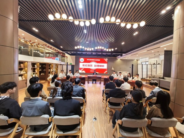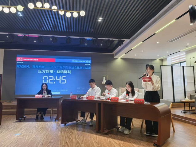 本次廉洁文化活动是由 研究生第四党支部书记余开华发起和组织策划的。反方四辩——王一卓,是一名电气工程专业研究生,她有着丰富的辩论经验,本科和研究生期间都担任了 校辩论队领队的职务。2024年推优成为入党积极分子后,她热心党务工作,将自身擅长的辩论活动和党支部相关工作结合起来,参与策划本次“党纪清风,辩理明晰”廉洁文化展示活动。
