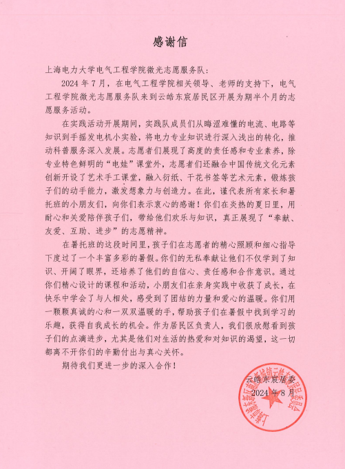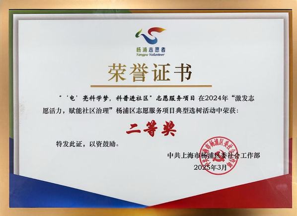 近日,在杨浦区2024年度“激发志愿活力,赋能社区治理”志愿服务项目典型选树活动中, “‘电’亮科学梦,科普进社区”志愿服务项目从83个参选项目中脱颖而出,荣获优秀项目二等奖。该项目充分发挥专业特色,自2018年启动以来,连续六年走进社区、中小学等,组织500余名志愿者累计开展服务200余次,辐射5000余名青少年,以电力科普为纽带,专业赋能社区治理、青少年课后服务与青少年科学素养提升等,用“电娃”小课堂为青少年托起成长“大平安”,获评2024年团中央“七彩假期”关爱行动志愿服务团、上海市青年志愿服务典型案例。